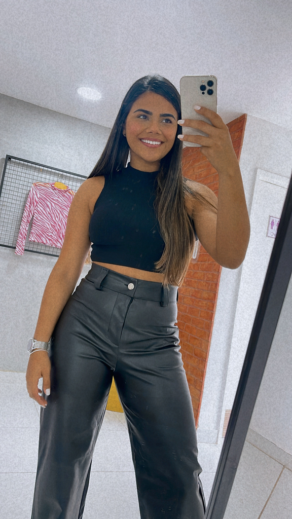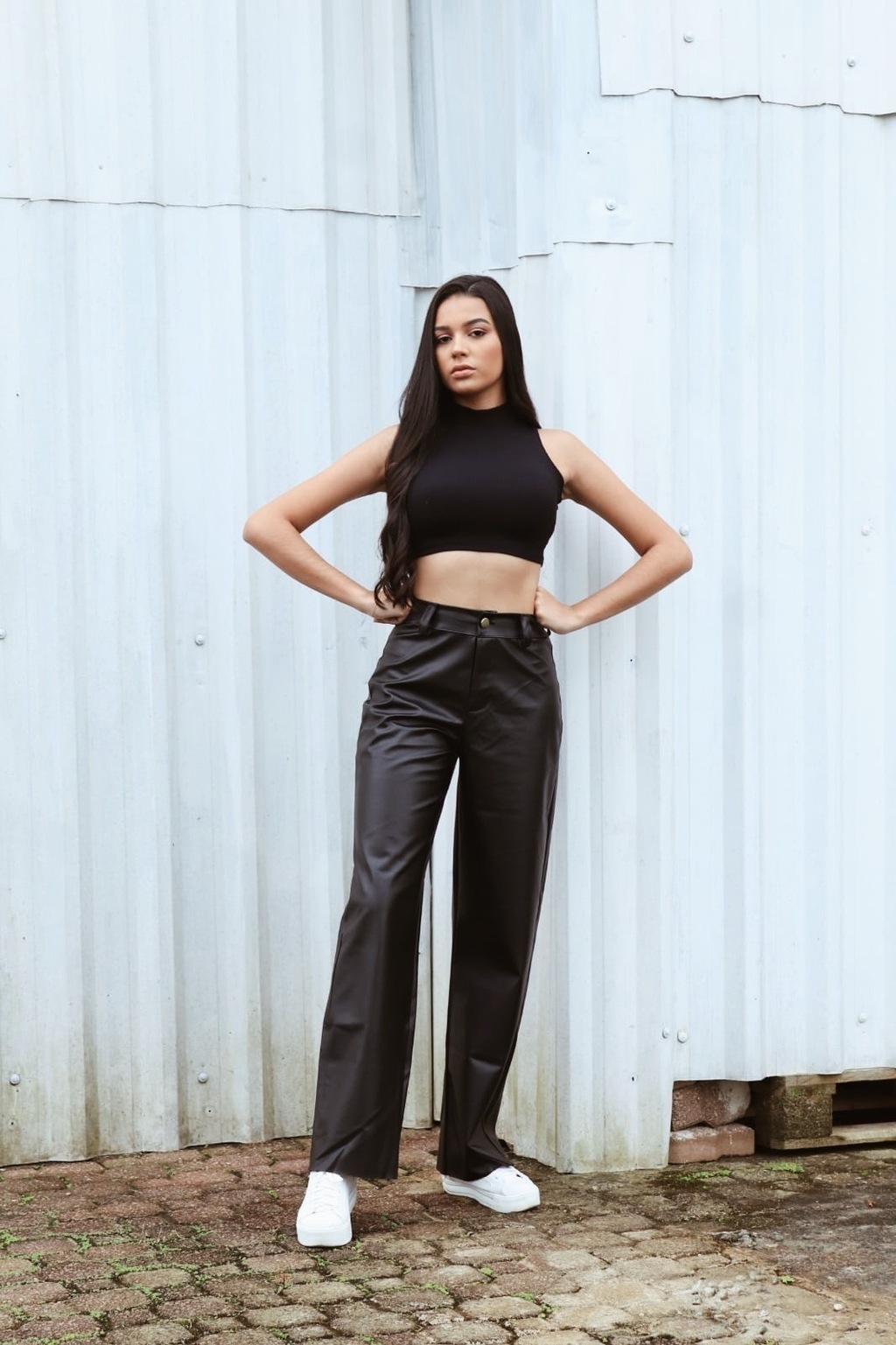 Calça em couro fake preta, modelo wide leg com fechamento em zíper e botão. uma peça que é tendência internacional e é cheinha de estilo! resgata uma vibe dos anos 90 e é super fácil de montar um look fashionista.