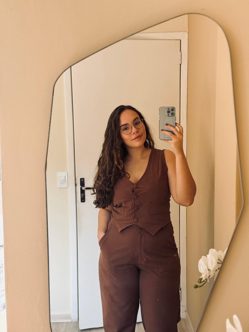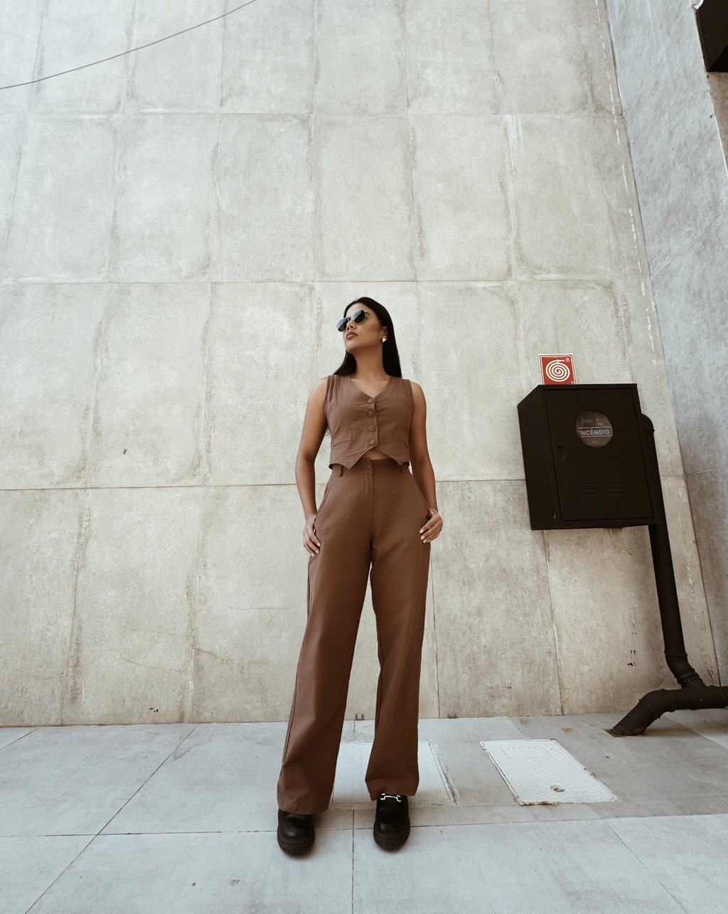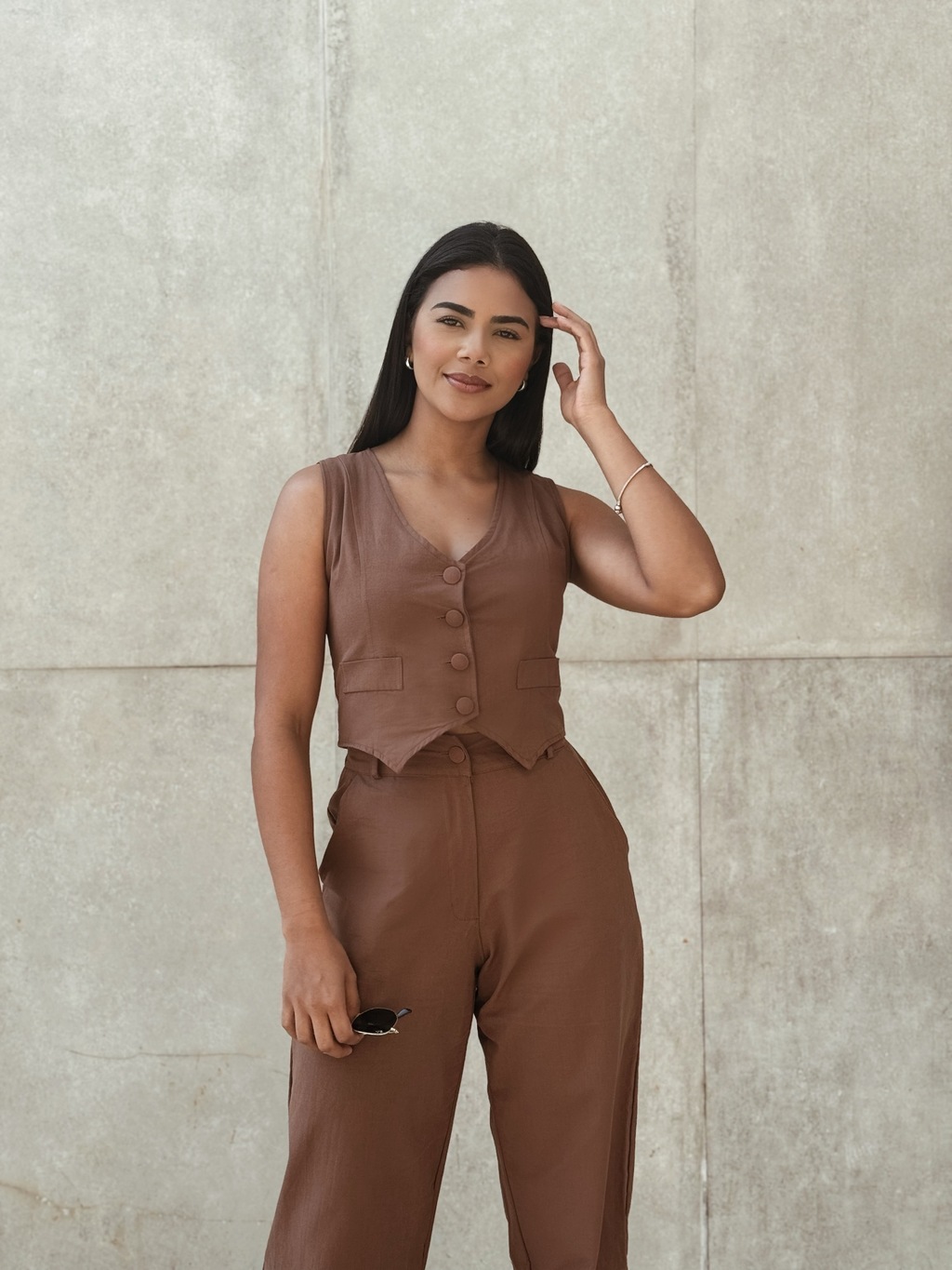 Conjunto de duas peças: parte de cima colete regata, com quatro botões encapados e bolsos falsos; calça em modelagem reta com zíper, botão encapado, bolsos laterais e elástico no cós;